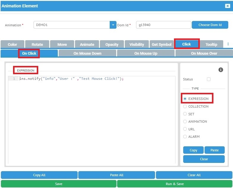 Click-Expression ile bir nesnenin mouse olayına bağlı olarak custom bir expression yazabilirsiniz.