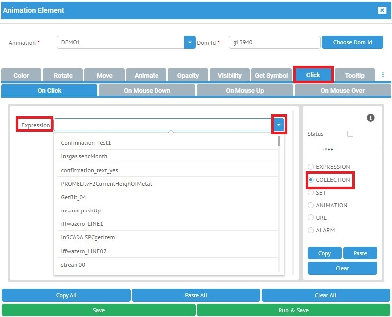 Click-Collection ile bir nesnenin mouse olayına bağlı olarak expression kütüphanesinde hazır bir expression'ının çalıştırılmasını sağlayabilirsiniz. ( Bakınız Expressions )