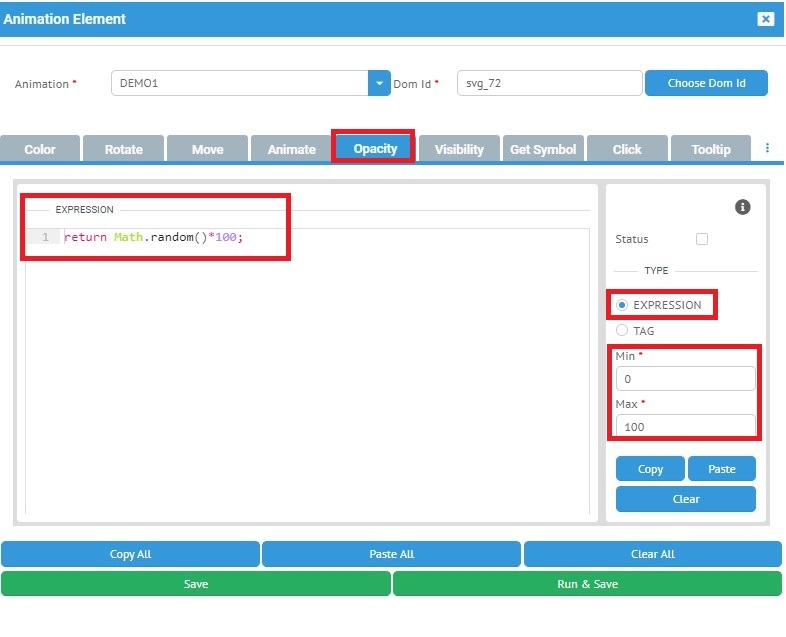 Edit Animation Element sayfasında expression özelliğini seçerek kod yazım alanı açılır. Bu alanda yine min max değerleri arasında dilediğiniz koşul / şarta bağlı olarak kod yazarak opacity özelliğinin çalışmasını sağlayabilirsiniz.