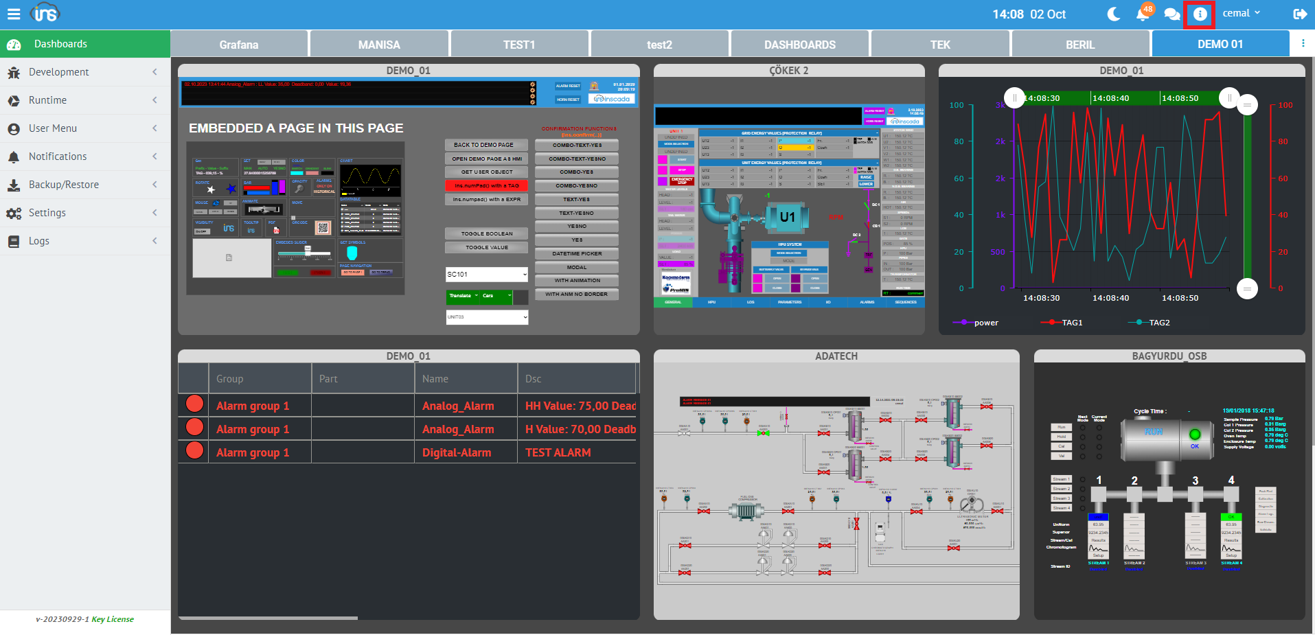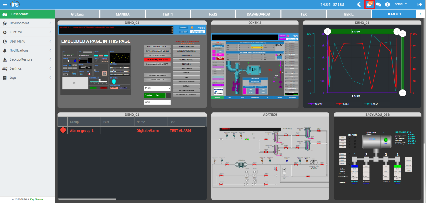 Resim 1'de görüldüğü gibi inSCADA sol tarafta kullanıcı seçeneklerinin bulunduğu bir menü, orta kısımda menü seçeneklerinin sunulduğu bir alan ve üst sağ köşede mevcut kullanıcı bilgisi, dil seçenekleri, bağımsız çalışma alanları, temalar, şifre güncelleme, kullanıcı arayüzü ayarları ve alarm ayarları gibi sezgisel olarak aradığınızı bulabileceğiniz bir arayüz sunmaktadır.