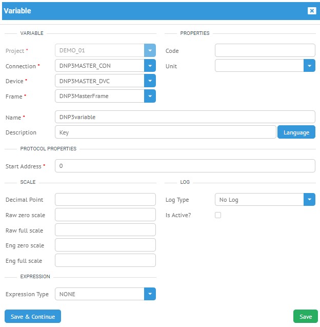 Resim 5'da görüldüğü gibi önceki adımlarda oluşturduğumuz DNP3 Master'ımıza bağlı bir değişken oluşturuyoruz. Form üzerinde ;