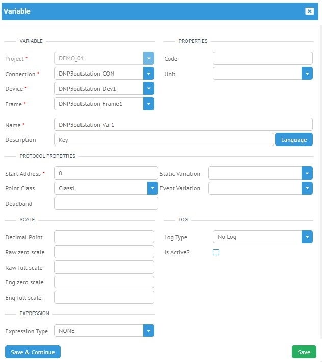 Resim 5'da görüldüğü gibi önceki adımlarda oluşturduğumuz DNP3 Outstation'ımıza bağlı bir değişken oluşturuyoruz. Form üzerinde ;