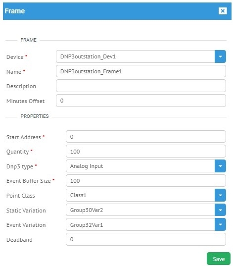 Bu adımda artık DNP3 Outstation'ımız veri bloklarını oluşturuyoruz. Burada oluşturduğumuz veri blokları DNP3 Outstation'ımız için veri dizileri anlamına gelmektedir. inSCADA Platformumuzdaki DNP3 protokolümüz 7 farklı tipte Frame oluşturmamıza olanak verir. Bunlar ;