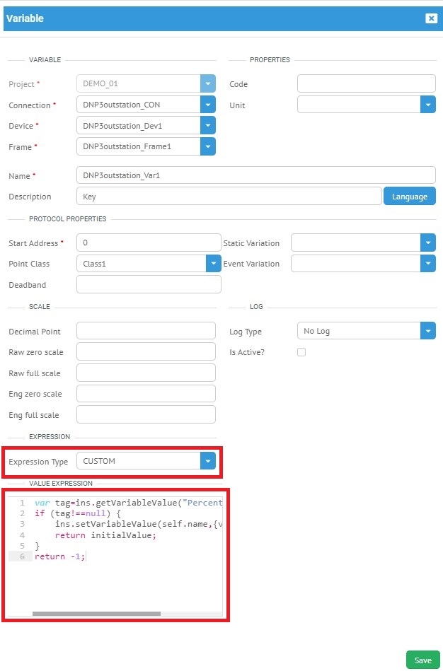 Yukarıdaki javascript ile ilk satırında önce, platform içerisinde daha önce tanımlanmış "Percent" isimli değişkeni "tag" isimli değişkenimize alıyoruz. Altdaki kısımda değişkenimizin Null kontrolü yaparak ins.getVariableValue API'imizin başarılı olup olmadığını kontrol ediyoruz. Şayet başarılı ise "tag" ismi ile almış olduğumuz değişken değerini, Outstation değişkenimizin kendisine yazıp tekrar kendi değerini platforma gönderiyoruz. En altda işlem başarısız olursa outstation değişken değerinin -1 görünmesini sağlıyoruz.