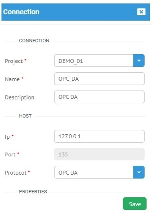 add ikonu yardımı ile yapılmaktadır. Resim 1'de gösterildiği gibi açılan bağlantı ekleme menüsünde proje seçilir, ad ve açıklamalar yazılır, ip eklendikten sonra protokol olarak "OPC DA" seçilir.