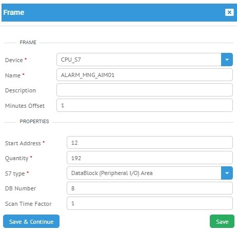 Resim 7 de örnek olarak ele aldığımız 8 numaralı DB ye erişmek için inSCADA platformunda yapılması gereken tanımlamaları görmektesiniz. Önceki adımlarda oluşturmuş olduğumuz Connection ve Device ' bağlı Frame oluşturuyoruz ve resimde de görülen aşağıdaki parametreleri giriyoruz.