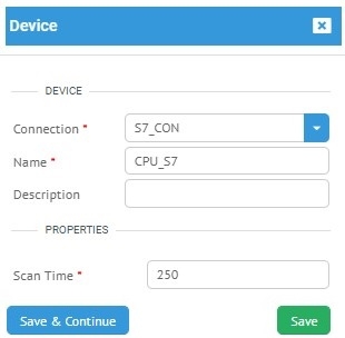 Resim 3 de görüldüğü gibi bir önceki adımda oluşturduğumuz bağlantı ya bağlı cihaz oluşturuyoruz. Burada Name ve Scan Time girilmesi gerekli parametrelerdir.