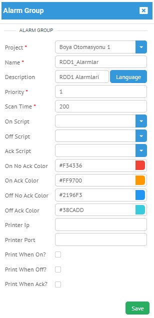 Ack Script : Alarm gruplarınız için ack-script tanımlayabilirsiniz. Bu sayede alarm grubunuza bağlı herhangi bir alarm kullanıcı tarafından onaylandığında (acknowledge), bir script çalıştırabilirsiniz.