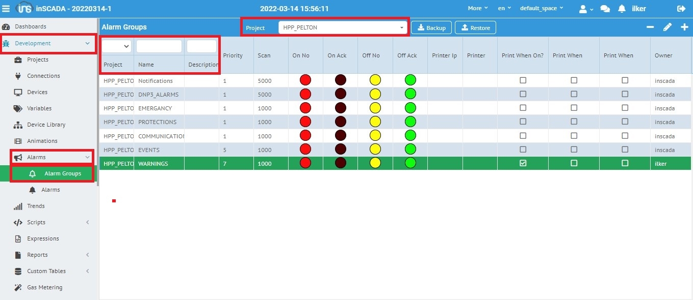 Resim 1 de gösterildiği gibi dilerseniz tüm alarm gruplarını görüntüleyebilir, proje bazlı , alarm adı veya açıklamalarına göre filtreleyebilirsiniz. Ana ekran üzerinden alarm gruplarınızın öncelik değerlerini, alarm durumuna göre alacağı renkleri , otomatik print alınıp alınmayacağını ve alarm gurubunun kim tarafından oluşturulduğunuda takip edebilirsiniz. Alarmların otomatik olarak yazdırılması için Line Printer tanımlayabilirsiniz.
