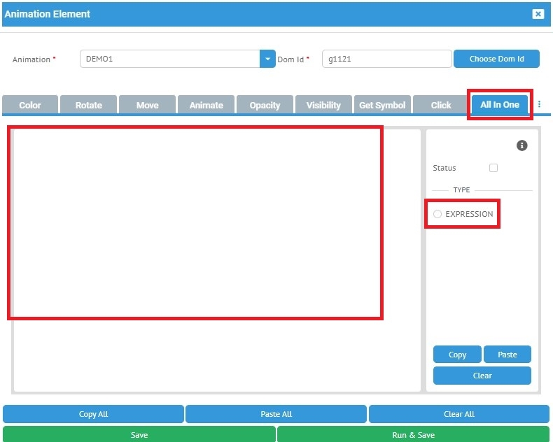 All in One animasyon özelliği ile şimdiye kadar gördüğümüz tüm animasyon çeşitlerini java script dili ile kendi yazacağınız kodlamanız ile tek bir script altında toplayarak inSCADA'ya entegre edebilirsiniz.