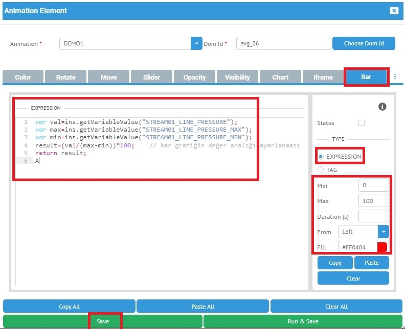 Min - Max : Resim 1'de görüldüğü gibi bir mimik ekran üzerindeki bir diktörgen nesnesinin "Percent" isimli bir değişken değerinin 0-100 aralığında oransal olarak dikey olarak boyutlarının değişimini yapılandırıyoruz.