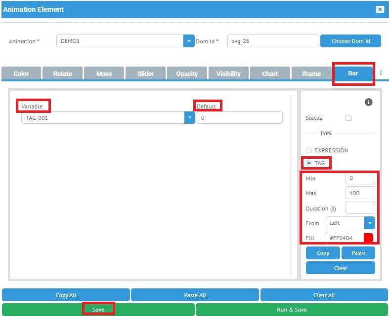 Bar animasyonunu tag tipi ile tasarlamak , ilgili mimiği bir değişkene bağlayarak değer almasını ve bu değere göre boyut değiştirmesini sağlamaktır.