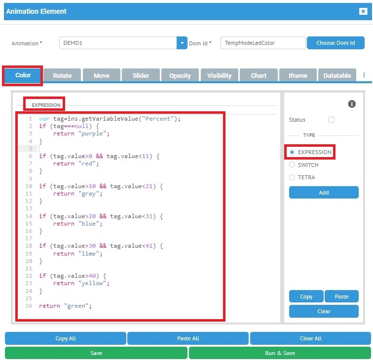 Expression alanı ile kendi java script kodlarınızı kullanarak dilediğiniz koşul / şarta göre color özelliğinin çalışmasını sağlayabilirsiniz.
