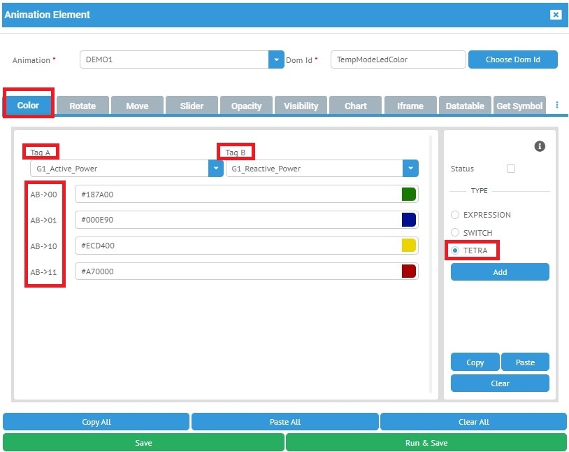 Color type tetra özelliği, seçili bir nesnenin iki farklı değişkene bağlanarak değerlerine true/false olarak beraber kontrol ettiği ve buna göre renk almasını sağlamaktadır.