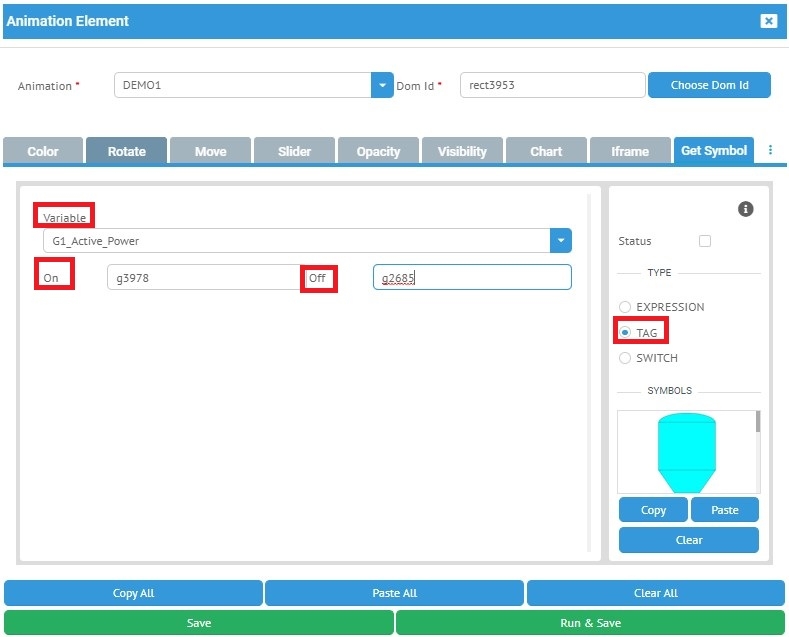 Açılan menüde üst alandan " Get Symbol " menüsüne ulaşılınır. Variable alanından hangi değişken için işlem yapılması isteniyor ise seçilir. Add ikonu yardımı ile hangi koşul ve değerlerde hangi sembolün göünmesini istiyor isek o kadar kural girişi yapılabilinir. Örneğimizde su tankı seviyelerine göre değer 90 üzeri ise ayrı, 80 üzeri ise ayrı, 70 üzeri ise ayrı sembol atamaları yapılmıştır. Burada önemli olan nokta sembollerin sisteme nasıl aktarılacağıdır.