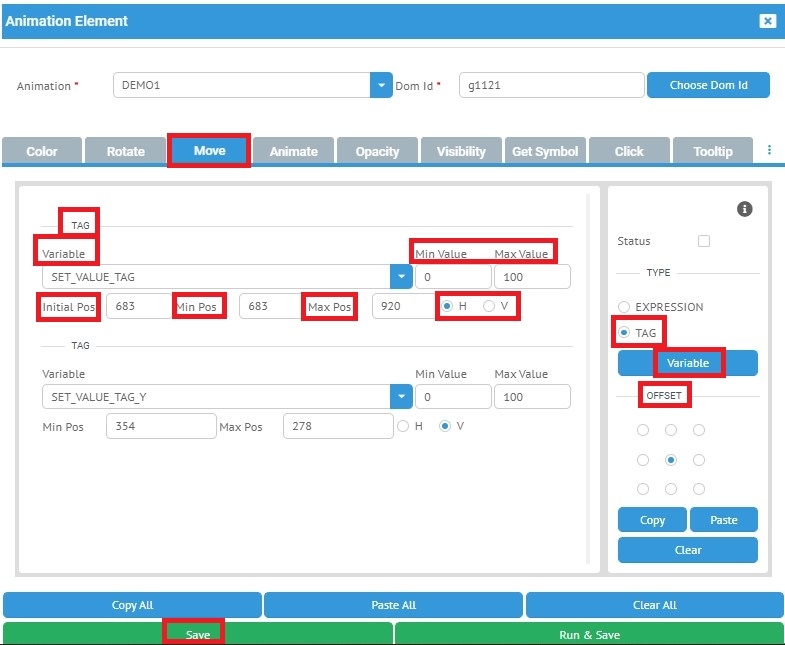 Move animasyonunu Tag tipi ile, nesneyi bir veya birden fazla değişkene bağlayarak aldığı değere göre yatay veya düşüy hareket etmesini sağlamaktadır. Örneğimizde mimiğimiz yatay için ayrı düşey için ayrı değişkenlere bağlanmış olup aldığı değere göre iki şekilde de hareket edebilmektedir.