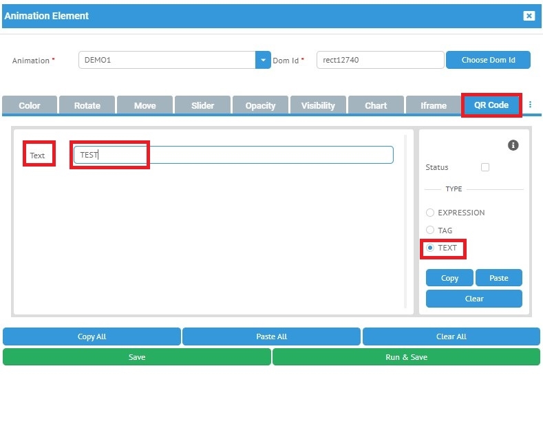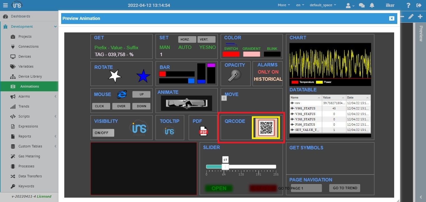 QR Code alanı " Animasyon " sayfamıza eklediğimiz ve bir değer atadığımız bir değişkenin " Visualization " ekranında görüntülenirken otomatik olarak qr codu'nun oluşturulmasını ve barcode okuyucular ile ulaşılmasını sağlamaktadır.