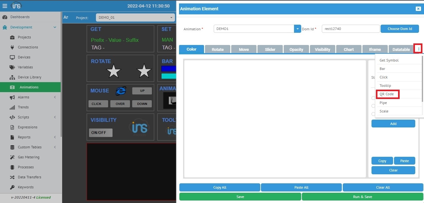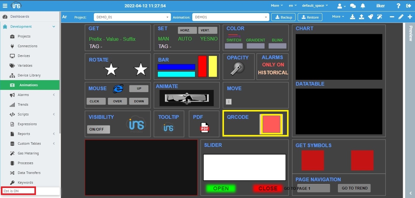 Development modülü altında bulunan " Animasyon " sayfamızda öncelikle klavyede "CTRL" tuşuna basılarak "CTRL On" modu aktif hale getiriliri. Resim 1 de gösterildiği gibi ilgili Qr code için oluşturduğunuz alanı seçilerek ekranın sağ üst köşesinde bulunan