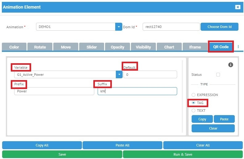 Örneğimizde ( resim 4 ) QR Kod " G1 active power " değişkenine bağlanmış olup, haberleşme olmaması durumlarında " 0 " değeri atanması ayarlanmıştır. Ön ekinde " power " son ekinde " kW " textlerinin gösterilmesi yazılmıştır.