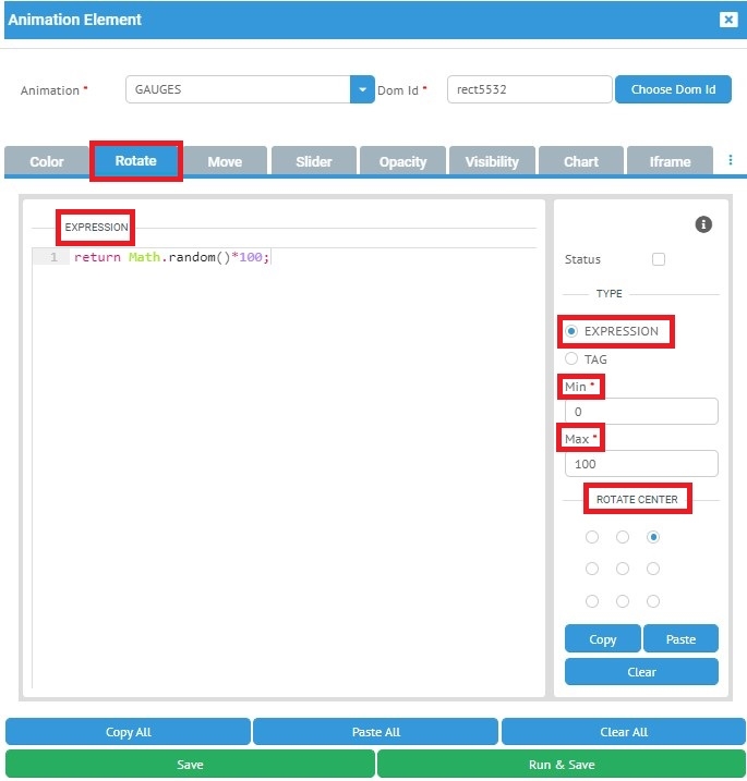 Resim 1'de sağ tarafdaki formda min-max değerleri 360 derecelik açıyı ölçeklendiriyoruz. Özetle 0 derecelik açı min değerine, 360 derecelik açı max değerine karşılık gelmektedir. Yukarıda verilen örnekte expression sonucu 0-100 değeri arasında oluşurken, nesne 0 ile 360 derecelik açı aralığında dönüş yapacaktır.
