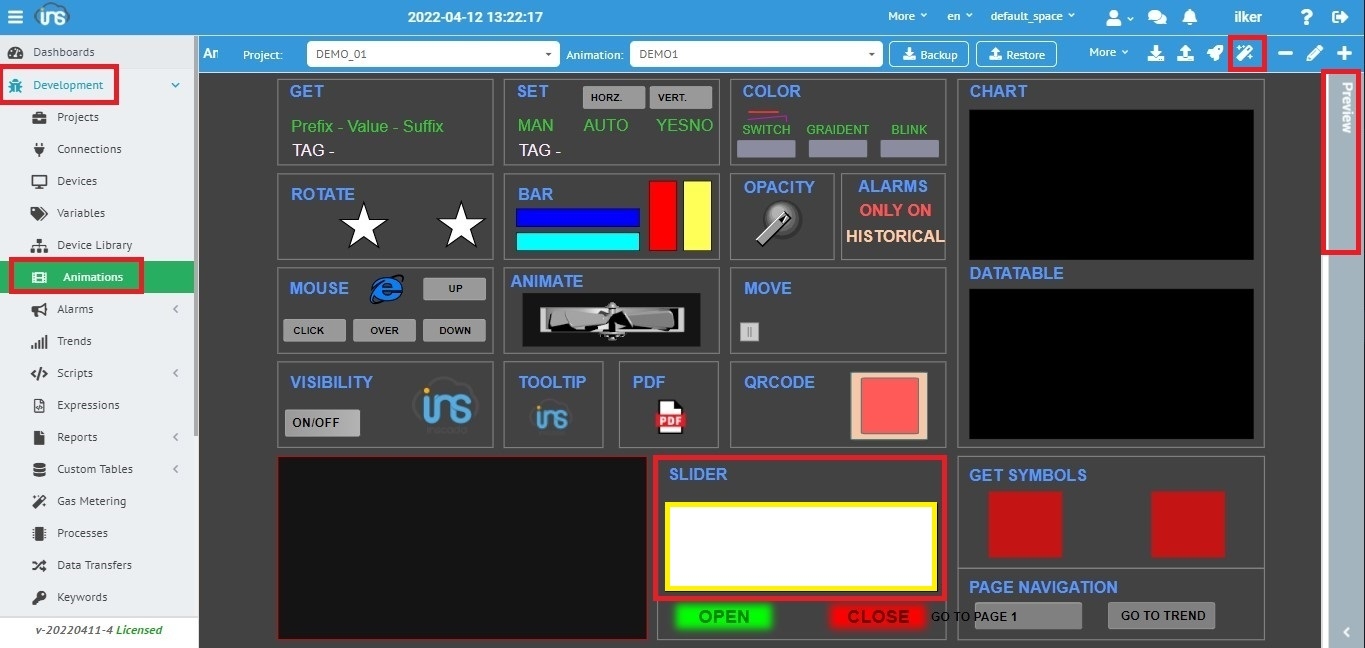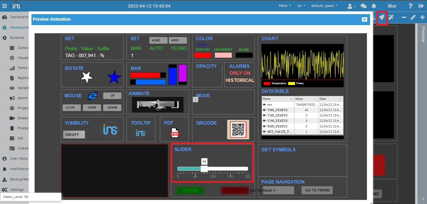 Bu özelliği animasyonlarımıza eklemek için animasyon sayfamızın tasarım aşaması olan edit svg aşamasında slider'ın sığabileceği büyüklükte, isteğe bağlı olarak yatay veya dikey bir alan eklenmelidir. Eklediğimiz alanı Resim 1' de gösterildiği gibi animations ekranında "ctrl on " özelliğini aktif ederek sarı ile belirtilen alanı seçip, ana ekranın sağ üst köşesinde bulunan