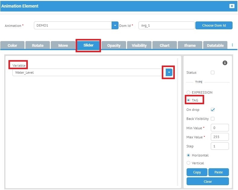 Animation Element menüsünde Resim 2 'te gösterildiği gibi " Slider " alanına gidilir. Bu menüde slider'a bağlamak istediğiniz değişkeniniz " variable " alanından seçimi yapılır. Menünün sağ alanında ise min - max değerleri belirlenir, " step " alanında ise değerlerin hangi aralık ile değişebileceği değer girilir. Yatay veya dikey seçimi yapılarak kaydedilir.