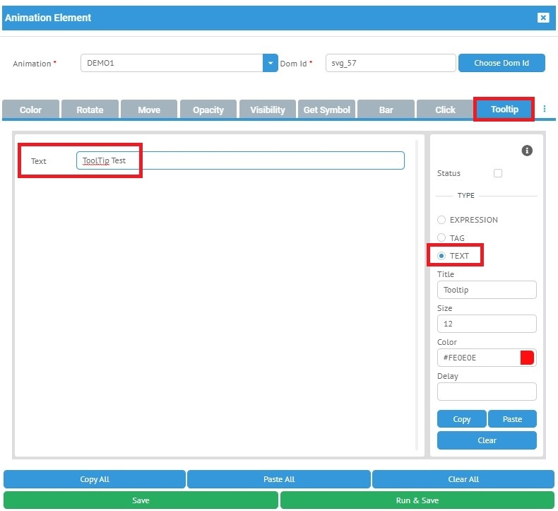 Expression alanı ile kendi java script kodlarınızı kullanarak dilediğiniz koşul / şarta göre tooltip özelliğinin çalışmasını sağlayabilirsiniz. Örneğinizde sadece tooltip özelliği eklenen animasyonun üzerine geldiğinizde başlığı " Tooltip " olan , kırımızı ve 12 punto yazı büyüklüğü ile " Tooltip Test " yazılması sağlayan basit bir script yazılmıştır.