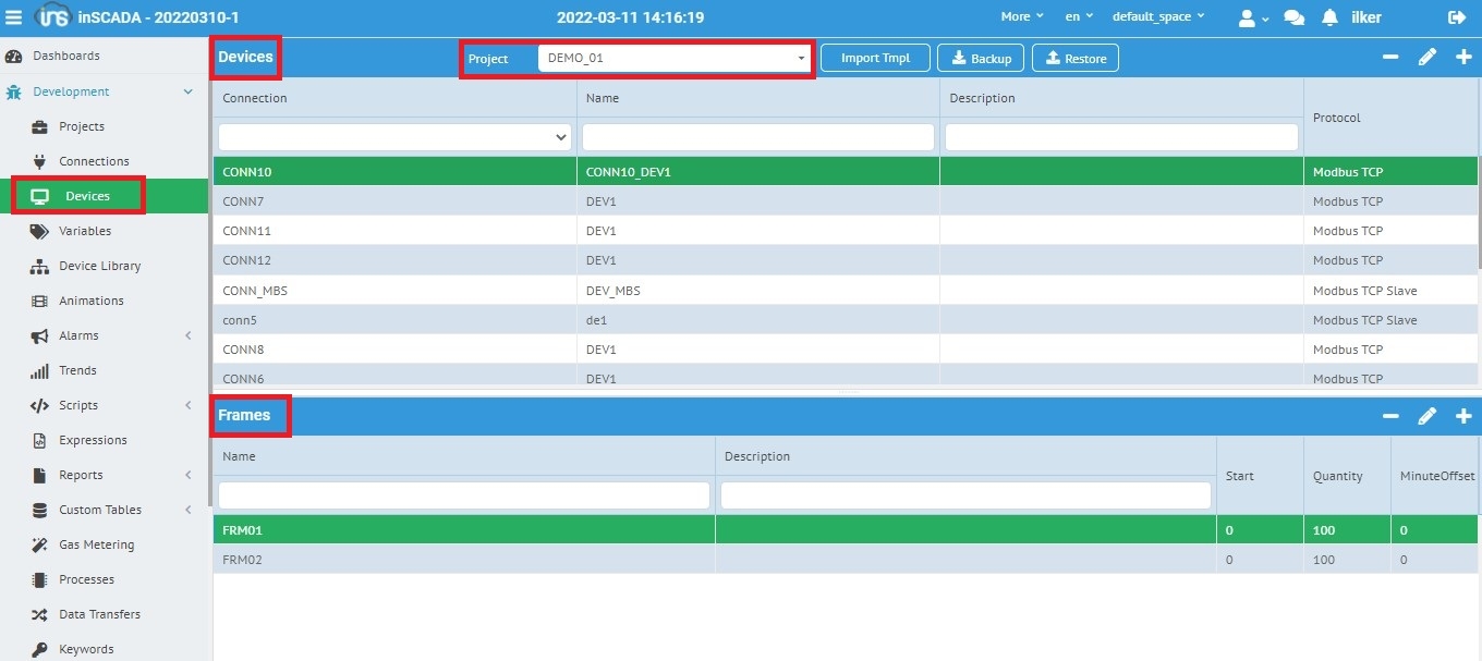inSCADA içerisinde bağlantı kurulacak cihazlarınızı tanımlayabilirsiniz. inSCADA haberleşmek istediğiniz herhangi bir cihazı (PLC, RTU, Flowcomputer etc.) kullandığı haberleşme protokolü ve bu protokolüne bağlı parametreleri ile modeller. Protokollerden bağımsız olarak bu modelinin en önemli ortak noktası veri blokları dır. inSCADA da cihaz üzerinden veri alış-verişi için bloklar tanımlamanız gerekmektedir. Bu veri bloklarına inSCADA içerisinde Frame adı verilir. Daha detaylı açıklma için Mimari bölümüne bakabilirsiniz.