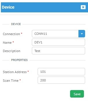 add ikonu ile " device add form " u açılır. Açılan formda Resim 3 te gösterildiği gibi cihazın bağlantısı seçilir, bağlantı adı ve açıklaması girilir , istasyon adresi ve tarama zamanı verileri girilerek " yeni cihaz " verileri girilmiş olunur.