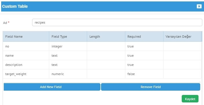 ikonu ile dilediğiniz kadar field ekleyebilirsiniz. Fieldlarınızı eklerken açılan satırda, field'ınız ismini girmeli, tipini seçmeli, uzunluk değerini girmeli, true/ false seçimini yaparak , eğer varsayılan bir değeri var ise son olarak o değeri girmeniz yeterli olacaktır. ( Resim 2 de gösterilmiştir )