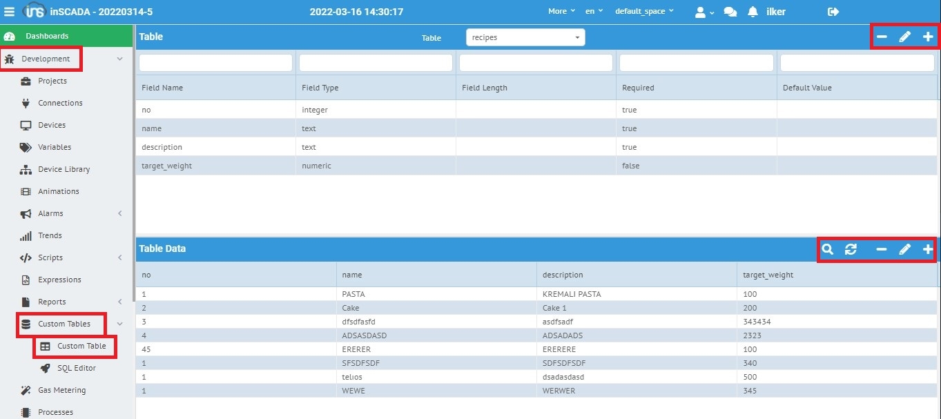 Custom Table menüsü, İnscada bünyesinde olmayan ancak kullanmak istediğiniz tablolarınızı sql içerisinde manuel olarak oluşturmanıza ve bu tablaların içerisine fieldlarınızı eklemenize olanak sağlamaktadır.