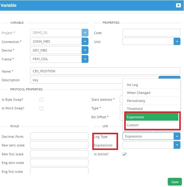 Variable logs'da yazılan expressionlar, sonucu true olduğu durumlarda değişken değerinin veritabanına tarama periyodunda kaydedilmesini sağlar. Expressions ekranından oluşturacağınız ifadelerinizi Resim 3'te gösterildiği üzere variable log type expressions alanından seçebileceğiniz gibi custom olarak da yazabilirsiniz.