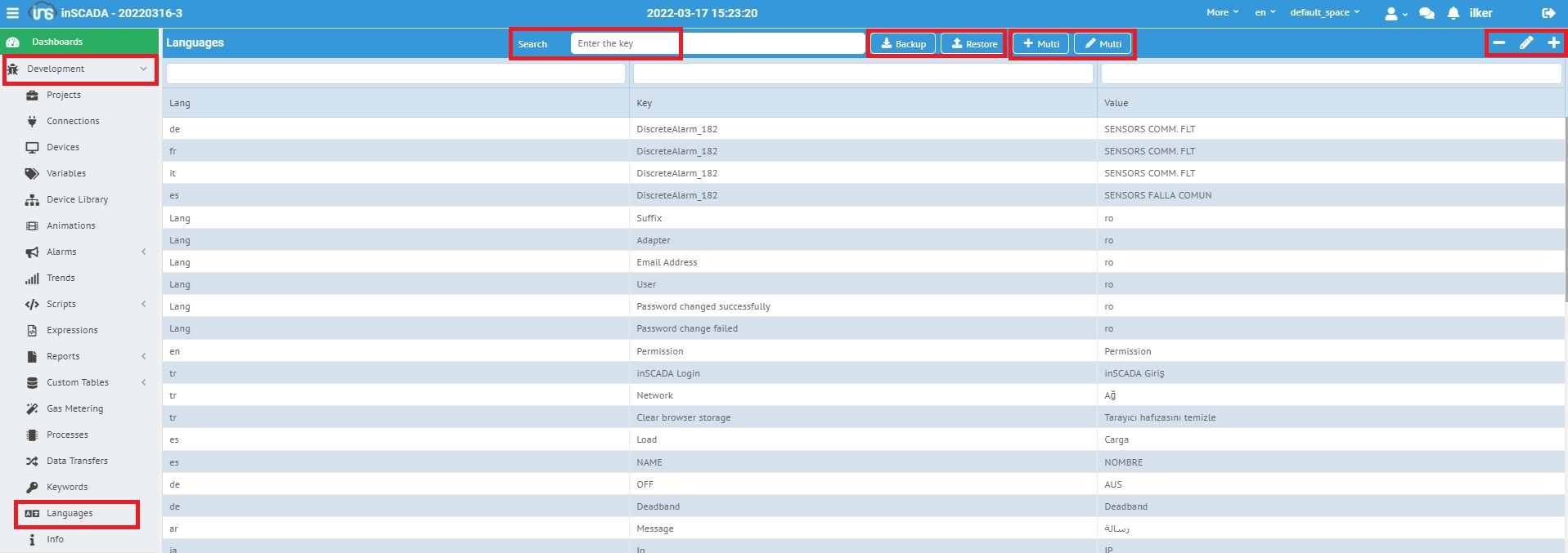 Languages ekranında sistem kaydı yapılmış tüm verilere erişeileceğiniz gibi, ana kelime üzerinde de filtreleme yapabilirsiniz. Ekranda ilk bölüm hangi dil olduğunu, key alanı ana kelimeyi , Value alanı ise ana kelimenin belirtilen dil karşılığını göstermektedir.