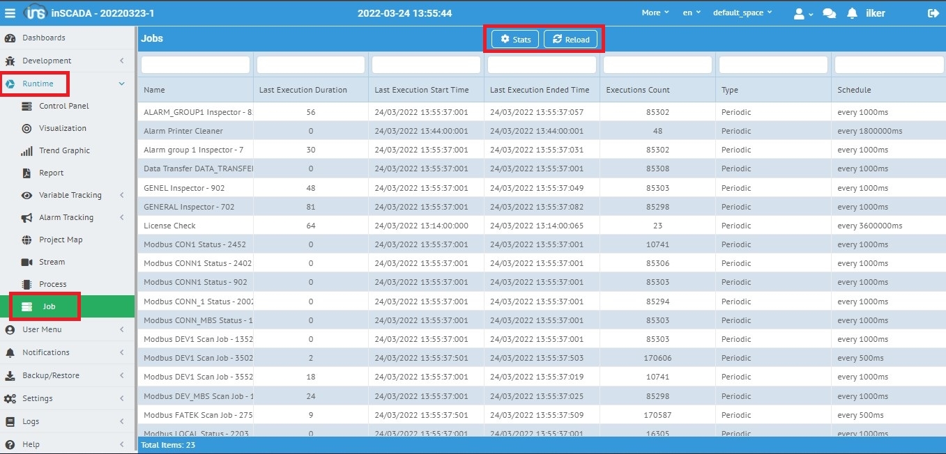inSCADA platformu arka planda tüm işleri periyodik olarak çalıştırdığı servislere sahiptir. Bu servislerin hangi periyotta çalıştığı veya çalışıp çalışmadığı bilgisine bu kısımda erişirsiniz. Örneğin bir bağlantıyı çalıştırdığınızda o bağlantı altında bulunan cihaz ve veri bloklarının kaç ms periyotta çalıştırıldığını görebilirsiniz. Aşağıdaki Resim 1'de örneği görebilirsiniz.