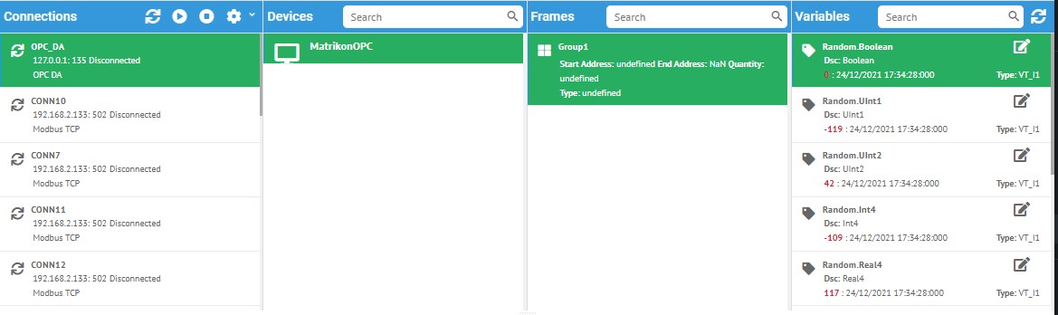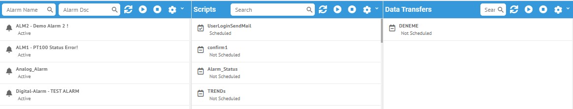 Resim 1'de görüldüğü gibi üst kısımda bulunan Connection-Device-Frame-Variables bölümü birbirlerine master-detail olarak bağlıdır. Kullanıcının bağlantı seçmesi ile beraber, seçili bağlantı ile ilişkili Device-Frame-Variables panelleri otomatik olarak güncellenir ve ilgili kayıtlar gelir. Hemen altındaki Alarms ve Scripts panelleri ise tüm alarmları ve scriptleri gösterir.