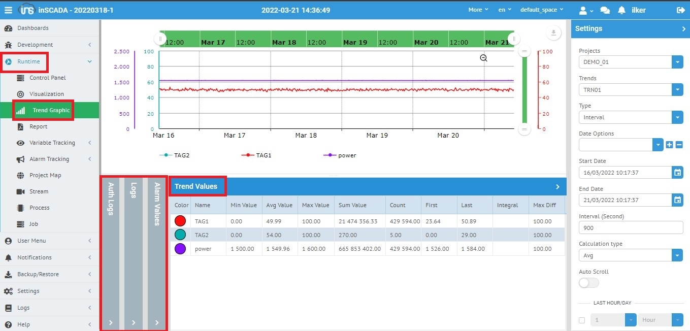 Auto Scrool : Trend grafiğin set edilen zaman aralığında otomatik olarak güncellenerek zaman filtre set değerlerinin kaydırılmasını sağlar. Bu gösterimde veriler veritabanı' nın dan getirilir. Güncelleme periyodu olarak Interval değeri kullanılır.