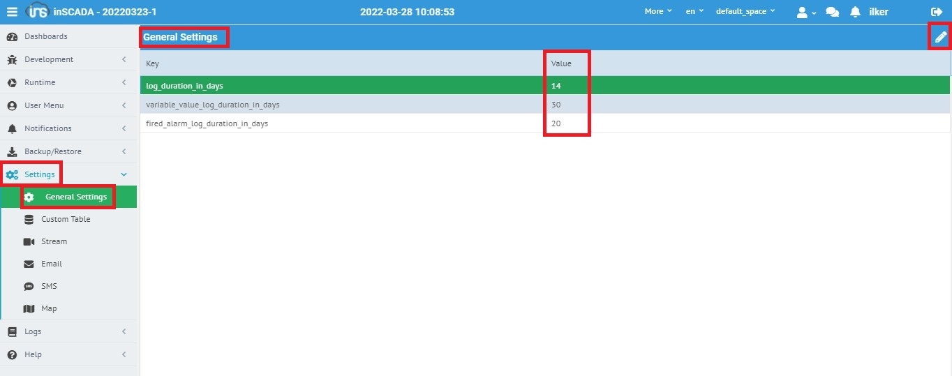 inSCADA genel ayarlarının gösterildiği ve düzenlenebildiği ekrandır.