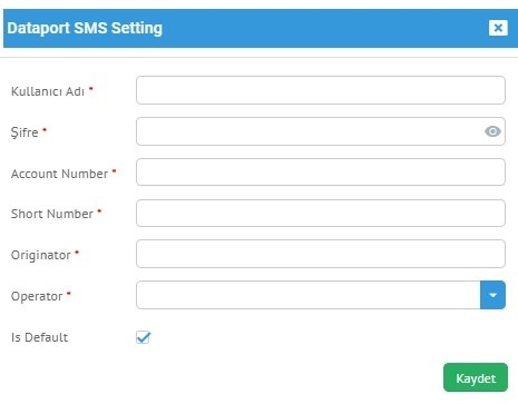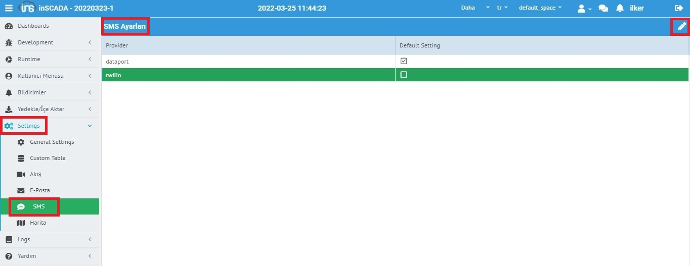 inSCADA üzerinden SMS gönderimini sağlamak için SMS bağlantı bilgilerinizin gösterildiği ve giriş yapıldığı ekrandır. Sistem yurt içi operatör için dataport , yurtdışı operatör için twilio uygulamalarını desteklemektedir.
